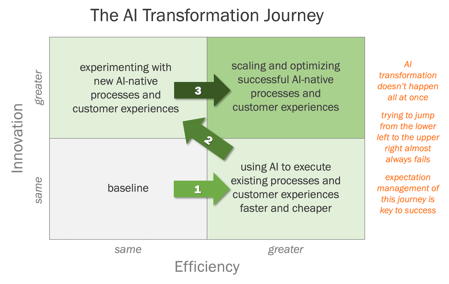 That doesn’t mean the teams driving this transformation are lollygagging about. It’s a high-gear intensity for everyone in this period of disruption. But you can’t skip over major stages of the journey. You need to take it a step at a time to learn what the technology can and can’t do. But more importantly, you need to understand its dependencies and ripple effects. You need to figure out which legacy processes need to be updated — and which ones need to be entirely reinvented or gracefully put to pasture.
