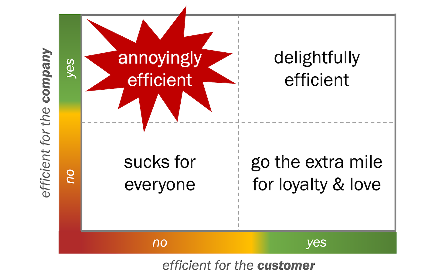 Always have a way to reach a real human. AI and automation can be efficient for customers as much as it is for the company — when it addresses the customer’s needs. But it’s never going to be 100%. The edge cases are infinite. And while not all of them will be valuble opportunities lost, some of them will be. If a customer wants to reach a human, you probably want them to as well. The lower-right corner in the 2×2 at the top of this article sums it up: go the extra mile for loyalty & love.